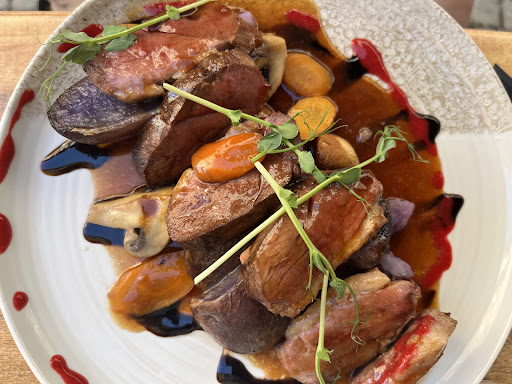 We discovered this gem during our trip through France, and it absolutely blew us away! From the moment we sat down, we knew we were in for something special. The duck breast was exceptional - cooked to perfection with a beautiful sear and incredibly tender interior. The elevated presentation and sophisticated flavor profile with rich sauce and expertly prepared seasonal vegetables showed real culinary artistry. We also tried their vegetarian dish which was remarkably refined - they transformed simple vegetables into something truly elevated and complex.