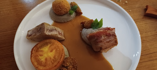 J'ai pris le "entre terre et mer" et ma femme la "Jardinière iodée 2 services" Là encore la promesse du plat n'est pas tenue. Je n'ai pas eu une mousseline de bananes jaunes mais une mousseline d'igname et comme légumes grillés de saison, je n'ai eu qu'une moitié de tomate, un peu fade. Seul point positif, la poitrine de porc était fondante même si un peu trop salée à cause de sa barde autour. Le serveur s'est excuser en m'expliquant que le chef travaille les légumes de saison et qu'il avait remplacé les bananes par de l'igname. Pour info, on trouve des bananes de Guadeloupe sur tous les marchés locaux en ce moment, et toute l'année je crois. Et pour l'assiette de ma femme, son crémeux n'était pas à la citronnelle mais au giraumon, elle a eu 2 gros morceaux de poissons (le même, du thazard) dont un qu'elle n'a pas fini, et pour le côté iodé de la promesse, pas senti. Son risotto de racines (de la patate douce) était bon. Bref sur ce, à la question "tout s'est bien passé", on a répondu non, que même si le repas n'était pas mauvais, il était plutôt fantaisiste et ne répondait pas à la promesse du menu. On a demandé si le chef Jimmy Bibrac était là. On nous a dit oui mais en partant au moment de payer, on ne l'a pas vu en cuisine (cuisine ouverte). Donc on a payé 97 euro pour 2 citronnades, 1 entrée et 2 plats. Chacun jugera à la vue des photos et de mon commentaire. Le service était correct mais sans vraiment de réponse à nos observations. Et le cahier de réservation qu'on a feuilleté en partant n'indique pas de resto complet, ni le vendredi soir ni le samedi soir. Il y avait seulement une vingtaine de couverts ce samedi soir 19/11. A vous de bien choisir mais sachez que l'on a trouvé beaucoup mieux...