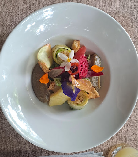 Absolutely wonderful food , both beautiful to look at and full of flavours. Lovely service too performed with panache by Gentil. An experience of great quality, well worth what we access in London where we live. The only remark would be concerning the music: some pop of sort, fairly loud where we were sitting and clashing with the overall style and level achieved in other departments. We will sing your praises...