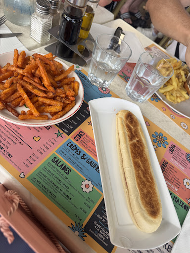 Great that the numerous vegetarian dishes are clearly labelled on the menu!! The veg focaccia was HISTORIC! Amazing fresh, crispy raw veg with roasted/grilled veg, marinated to perfection — delicious buffalo mozzarella and fantastic focaccia bread. Wish this was an option everywhere! My husband had the veggie burger — full of tasty quinoa. As he doesn’t like chèvre, they changed it for mozzarella for him. The only downside was that his pommes frites were on the soggy side. Service friendly & fast....