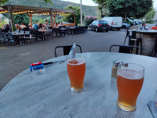 Arrivo: "C'è posto per due?" risposta "NO"; eppure dentro è vuoto... capisco che d'estate vogliano stare tutti all'aperto, e se non hai prenotato è difficile trovare un tavolo 'buono' la sera, ma almeno proponimi l'alternativa! ormai sappiamo che l'accoglienza corsa è analoga a quella ligure -cui siamo abituati per nascita- e non demordiamo, quindi ci viene proposto il posto 'bar' intorno alla botte, che va benissimo (notare, un tavolo da 4 resta vuoto per tutto il tempo fino a quando ce ne andiamo). Guardando il menu e i grandi piatti a sombrero, ci accorgiamo che non è più un locale da hamburger con patatine, ma si è 'dato un tono'... anche se non è segnato, avrei voglia di qualche salume e formaggi del luogo, che non ho ancora mangiato: non ne hanno (un locale dell'entroterra??!) allora decidiamo per il sauté di maiale e l'ossobuco di vitello; noto che il menu, rispetto alla media, è più dettagliato nelle descrizioni, e apprezzo, ma la soddisfazione scema quando vedo che nel mio piatto che un pezzone di polenta come nell'altro -prevista- peccato che non fosse indicata... e se non mi piacesse?? ma ringrazio che ci sia almeno quella, perché il sauté - un goulash saporito e ben cotto, ottimo!!- è decisamente abbondante, mentre nel mio, a parte una montagna di pomodoro e carote -un po' troppo dolciastri, peraltro- c'è UN SOLO ossobuco! e di vitello, ben più piccolo di quelli bovini. Mi faccio fuori tutto il pane a scarpetta, rubo qualche pezzo di maiale ma, più che la fame, resta il disappunto: due sarebbero stati pochini, ma non avrei potuto dire nulla; uno è una beffa. La signora viene a ritirare i piatti, e sempre in linea col garbo locale, si guarda bene dal chiedere se sia "andato tutto bene" (anche perché non spiccicano mezza parola di Italiano, come tutti) ma non mi scoraggia dal far presente la cosa; lei insiste che carne ce n'era, io faccio vedere l'unico osso nel piatto, fino a che l'uomo interviene, di nuovo insiste che carne ce n'era, infine mi propone di portarmene altra, rispondiamo che preferiamo passare al dolce, dunque di slancio proclama che li offrirà per compensare il disagio! mi pare eccessivo, cerchiamo di dirglielo, vedremo che succede alla cassa. Tiramisù ai canestrelli -ottimi biscotti locali a bastoncino, non le ciambelline liguri- sorprendentemente delizioso; il mio flan -dolce tipico francese che adoro- scialbo e pure poco dolce... ho capito che non è la mia serata fortunata. Al momento di pagare, lo slancio è già smorzato e ne usciamo con 1 dolce e 1 caffè offerti dalla casa. Nel complesso il posto è carino, i piatti curati e -alcuni- ben riusciti, ma l'esperienza complessiva, mi spiace, scoraggia...