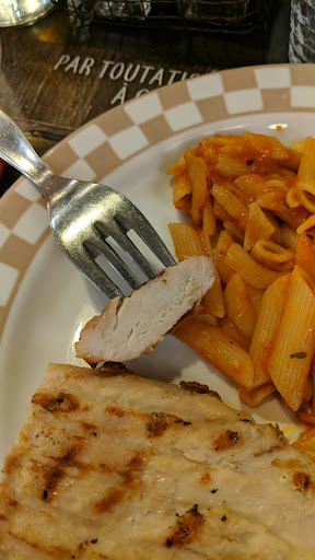 The strangest place I have eaten while in France, the waitress took our order (including an appetizer) and then vanished entirely for the next 40 min. Several tables were searching, in vain, for her during this time. We finally located her and reminded the poor thing that we had ordered an appetizer (cold charcuterie which should not take long to prepare) and she wandered off in a daze to retrieve it. After finishing the mediocre app, we had the pleasure of receiving some chicken that we had watched laungish on the grill for around a hour (see attached picture). I did not anticipate eating a meal of this calibure while traveling, and luckily the place had free WiFi so I could share my experience with the world! I would recommend obtaining some pre-packaged food from a service station before eating at this establishment. France has provided some of the most delectable meals I have ever consumed, this dinner has also ensured I got to experience one of...