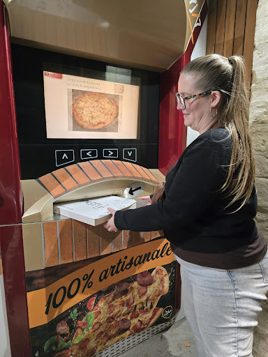 Owner was there and very helpful. Note that this place is just a kiosk/vending (for now). They were out of a lot of pizzas at the time but he said they were refilling the machine. You can choose to have it cooked or cook at home, but since it’s a machine you have to order the premade options. Comes with knife to cut it but since owner was there he offered to cut for us. Pizza is about sized for 1 hungry person or in our case perfect for my wife and I to eat one.