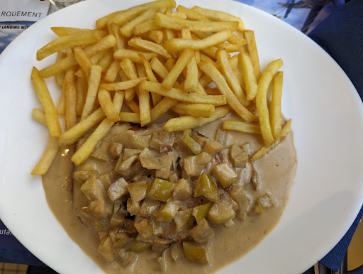 Read moreJe mets une étoile car on ne peut pas mettre 0! Nous arrivons et demandons au serveur( le plus jeune) si il y a une table pour 3. Il repond faut demander à mon collègue. Déjà il aurait pu le faire. Il y a des tables propres on nous attribue une table sale non débarrassée. Ensuite les cartes. Vieillottes! Et un choix qui laisse penser que rien n'est maison. C est impossible 10 sortes de moules, 7 salades, 10 plats de viandes autant de poissons , des galettes, et j en passe tout ca pour une salle pouvant accueillir 20 personnes! Et 1 seule personne en cuisine il est balèze! Kir normand bien trop de sirop Menu enfant frites congelées. Galette jambon fromage indescriptible une pate presque crue un centimetre d un amalgame de fromage dedans comme une bouillie de bebe. La salade immonde. Nous n'avons pas prit de dessert et le café n'est pas terrible. Avec le café il y avait un petit "tas" bizarre! La deco a revoir Une odeur épouvantable Et un service sans sourire amateur... Une note de 40 euros sans boisson a part le kir et sans dessert. C est cher. Bref nous ne comprenons pas les bons avis emis sur ce "restaurant" Peut etre se notent ils...