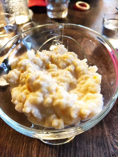 De postre arroz con leche, tenía trocitos de naranja... Me ha parecido un sabor algo raro, pero con cada cucharada me gustaba más.