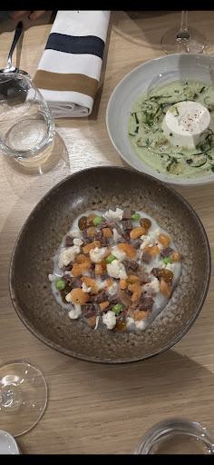 Yet another disappointing ”food experience” pointed out by Michelin. Really, what is the intention here? Farm to table yes ok but where is the craftsmanship, where is the execution, the respect for the ingredients? The flavours were poor. Especially one dish that I will post here. What is this? A white sauce in the bottom with a bitterness but no flavour. Salmon ok. But what are these gray peaces of meet mixed with the salmon and the flavourless white gel sauce? Something you needed to get rid of? Looks and tastes like the unseasoned peaces that had a couple of days too long in the fridge that I would give my dog. Cauliflower and peas that seems taken from one of these frozen packages in the supermarket, another flavourless addition to this disastrous dish. It’s a pity that places like this are pointed out in the guide, making it harder to find the restaurants that...