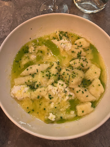 Read moreBilan mitigé à cause du service et de l'emplacement de la table. L'arrivée au restaurant : on a réservé 1 semaine à l'avance pour fêter mon anniversaire et on se retrouve à une table de bar au niveau des cuisines et du bar, avec de la musique à fond les ballons. Ce type de table va très bien pour des jeunes, mais pour nous (un peu moins jeunes), nous n'étions pas bien installés et c'était beaucoup trop bruyant à cause de la musique hispanique. Apéro : A la commande, les (très) jeunes serveuses ne prennent pas le temps de nous proposer les plats à partager qui sont à la carte (carte en feuille volante comme chez Flunch alors qu'on est dans du haut de gamme). Pourtant on en voulait, on a dû les rappeler et on a été servi quasiment à la fin de nos verres. Par contre, le champagne était excellent et le houmous également avec le pain fait maison. Le plat : tout est frais et très bon. Les gnocchis étaient fondants et bien grillés. Par contre la sauce était vraiment trop salé (un loupé du cuistot ?). L'agneau de lait est un vrai régal, la poitrine de porc de chez Ospital à Hasparren également. Le pain est exquis. En revanche, on demande un vin au verre pour accompagner nos plats : "on a un pinot noir, un riviera espagnole et un vin naturel". Aucune suggestion ni précision sur les vins pour nous orienter (elle n'en savait pas plus visiblement), finalement on continue au champagne. Le dessert : Si le restaurant a un chef pâtissier, il faut le garder !! C'était vraiment excellent, tout est hyper équilibré et les éléments se marient bien ensemble. Un pur délice gustatif. L'addition : pas de café car on n'en pouvait plus de la musique et on a plus l'âge pour les tables et chaises de bar. Le tout n'est quand même pas donné, même si on reconnaît que c'est frais et très bon. En revanche, il manque un chef de salle expérimenté qui cadre le personnel côté commercial, service et qui conseillerait un peu au niveau œnologique. Ce commentaire est pour aider à vous améliorer car le potentiel de cette brasserie est énorme grâce au lieu et à la qualité des plats. Mais il y a un mélange des genres où le service se veut jeune et branché, alors que les prix ne s'adressent clairement pas à cette clientèle (en voyant la moyenne d'âge en salle qui était plus comme nous, dans la quarantaine). On y retournera certainement, en espérant une...