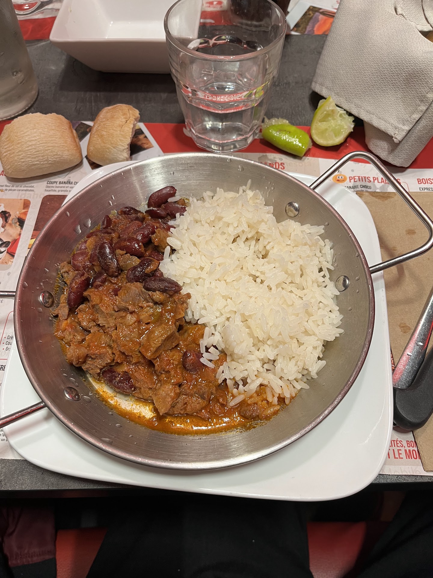 Le chili est tout sec, insipide et égal à un plat préparé en supermarché, voir moins qualitatif. Le riz ressemble à celui des cantines scolaires, sans parler de la quantité (à préciser que l’on peut demander à volonté le riz, mais au vu du riz, sans goût ni même quelques épices, le plat ne donne pas envie, au vu de la pauvre quantité de chili…). Je rappelle que ce plat coûte 16,90€.