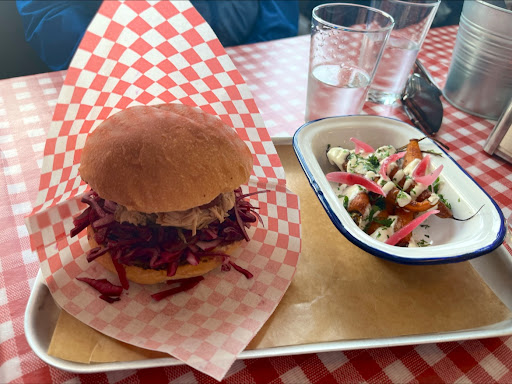 Superb terrace with ocean views, good for kids and dogs, super yummy bbq pork, chicken and more. All done really well with lovely home made sauces. If you like meat go here. Diner / BBQ vibes with nice beer and some natural wine. Also parking on site. Nothing else like it...