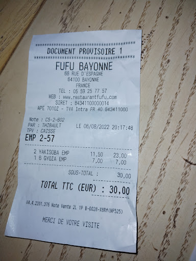 Read moreSi vous avez déjà été au Japon une ou plusieurs fois, ou, comme le prétend le "patron" hipster de ce restaurant, "tous les ans", et que vous êtes déjà entrés dans une "boulangerie française" comme ils en font là bas, vous aurez peut-être une idée du scandale d'appeler des Ramen ce que sert "Fufu" ramen. Une parodie médiocre qui resterait une simple fraude à l'exotisme, sauf qu'en plus du mauvais goût, le patron a l'indélicatesse de prendre ses clients pour des gros jambons, en essayant de nous faire croire -nous qui avons mangé un nombre incalculable de gyoza et de ramen dans les meilleurs établissements de Paris, Tokyo ou bien New York- qu’apparemment les gyoza collés et surtout indécollables sont le gold standard de la manière de faire cuire les gyoza, un véritable impératif, et je cite "une volonté de notre part", "pour faire comme au Japon"!!!!! De toute évidence nous n'avons pas su apprécier le travail d'artiste de ce monsieur qui décrète mieux savoir faire des gyoza qu'Ippudo, Dosanko, Higuma, etc......... Ce serait vraiment comique si cela ne devenait pas GLAUQUE et HONTEUX : ils ont engagé deux personnes à priori Japonaises à qui ils parlent vraiment mal (le patron et le jeune qui semble se prendre pour LE chef de toute une génération). ça donne une sale impression que ces deux employées servent de quota ethnique pour faire croire aux Bayonnais à l'authenticité de la cuisine Japonaise. Une arnaque à la limite du racisme.