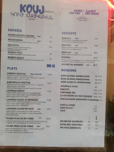 Read moreJe déambulais dans la ville, une faim grandissante en moi, lorsque je passai devant "Kouj". Irrésistiblement attiré par le charme de ce restaurant, je m'installai sur l'agréable terrasse. Le menu en main, hésitant devant cette offre de plats exotiques mais ravi de bientôt pouvoir gouter aux spécialités arméniennes, je passai commande à la très aimable gérante. J'ai choisi un houmous d'aubergines en entrée ; le meilleur choix d'entrée de mon existence. Raffiné, frais et très goûtu, ce caviar de légumes m'a mis en appétit pour la suite. Et quelle suite. Mes papilles se souviendront longtemps de ces exquises boulettes de pommes de terre farcies au poulet, de cette savoureuse sauce curry et de la salade fraîche qui accompagnait idéalement le plat. Pour le dessert, un baklava aux pistaches fut l'ultime plaisir concluant ce festin. Il serait inutile de préciser à quel point était délicieuse cette délicate pâtisserie.