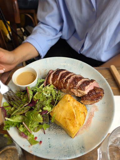 Read moreStopped off for lunch during a day trip to Biarritz based on the guide book recommendation. The manager was very friendly we had a good chat about London as he spent many years there in restaurants, but onto the food and service here...the food was decent and fairly priced, my wife and I we had the menu de jour, fish and mash with thyme both of which were tasty and I had the entrecote with fries which was on the rare side of "medium" I had requested but this is France and it was flavoursome so we both had clean plates and at 15 euro per dish there is no reason for any dissatisfaction. My daughter had the veal rib in a very tasty tomato and aubergine sauce, the veal was very tender and the sauce was well balanced(not too "tart" which can be with tomatoes). Overall I recommend this although I noticed the young waitress had been a little frosty when greeting us, luckily it was the manager who took our order and he was...