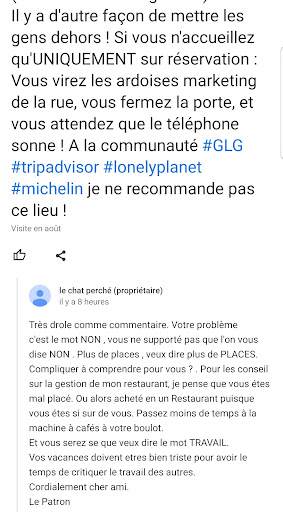 Avis initial 4/08/2019 : A en croire les avis précédents de la communauté, c'est sans doute une bonne cuisine mais il manque manifestement le sens de l'accueil (Madame est désagréable). Il y a d'autres façons de mettre les gens dehors ! Si vous n'accueillez qu'UNIQUEMENT sur réservation : Vous virez les ardoises marketing de la rue, vous fermez la porte, et vous attendez que le téléphone sonne ! A la communauté #GLG #tripadvisor #lonelyplanet #michelin je ne recommande pas ce lieu !