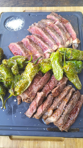 Pour le plat, nous avons partagĂ© une entrecĂŽte avec deux cuissons diffĂ©rentes : moitiĂ© Ă point, moitiĂ© saignant. Merci au serveur dâavoir trouvĂ© cette solution, câĂ©tait parfait. Les petits poivrons verts grillĂ©s (padrones, je crois) Ă©taient un vrai rĂ©gal, relevĂ©s juste comme il faut avec une pointe de sel.