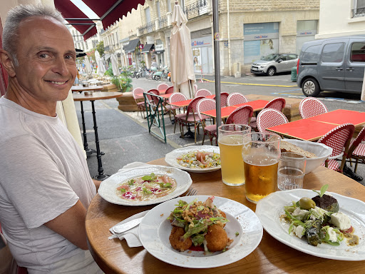 We had a reservation for 7:15 and we arrived 7:25. This is our fault as we thought it was 7:30pm. The food is not good, the steak ordered rare was actually gray inside— unusual for France. The Caesar salad had a balsamic dressing. Burgers were actually ok
