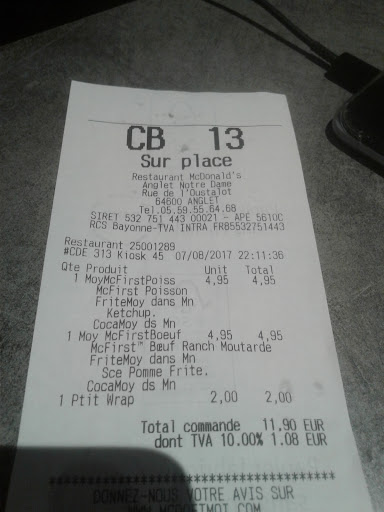 Read moreCommande sur place Ă 15h. Certes il y a encore du monde mais on attend quand mĂȘme 25 minutes pour ĂȘtre servis ( alors que d'autres installĂ©s aprĂšs nous sont servis avant ). Ă l'arrivĂ©e on a aucune des sauces demandĂ©es, 2 burgers erronĂ©s qui ne sont pas du tout au mĂȘme prix que ceux commandĂ©s... On va pour rĂ©clamer directement en caisse et lĂ , personne ne nous calcule ! Il y a pourtant du monde mais on se sent transparents ! Certes les Ă©quipiers sont occupĂ©s aux fourneaux ou Ă la prĂ©paration des commandes, mais mĂȘme la manager nous ignore. Une honte. On finit par interpeller une Ă©quipiĂšre qui amĂšne une commande, les erreurs sont finalement rectifiĂ©es. Les 2 burgers "erronĂ©s" sont jetĂ©s Ă la poubelle par les employĂ©s...LĂ encore une honte quand on sait que des gens meurent de faim et qu'ils auraient juste pu nous donner les bons sandwichs et nous laisser les autres ( qui auraient bien Ă©tĂ© mangĂ© par un de nous 6, mĂȘme si c'Ă©tait Ă un autre repas ). RĂ©ponse quand on fait remarquer que c'est pas terrible de faire ça : "c'est la consigne". Bien l'image renvoyĂ©e par McDo France. Bon et puis pour couronner le tout, toutes les tables sont sales, personne ne passe les nettoyer, les poubelles dĂ©bordent toutes... En somme, continuez votre route pour un autre McDo ou allez acheter un sandwich Ă la boulangerie Ange situĂ©e au mĂȘme...