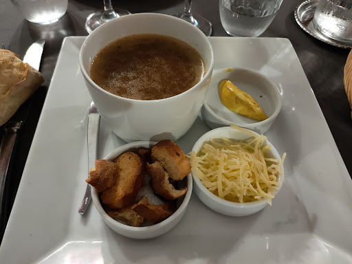 Repas: En entrée: soupe de poisson qui était très poivrée et qui n'avait donc qu'un gout de poivre. Mauvais équilibre. Plat: Nous avons pris deux plats de poisson. De la lotte avec des morceau de jambon et une sorte de beurre d'ail. C'était ok mais sans plus et c'était froid. L'autre poisson était un filet de poisson blanc (du maigre je crois) avec une crème à la citronnelle. Le plat était complètement insipide, la sauce n'avait aucune note de citronnelle (malgré la puissance de la citronnelle...) et les accompagnements n'étaient vraiment pas bons (un flan de courgette comme on en voyait chez les traiteurs il y a 15 ans et une purée de pomme de terre quelconque). Le pire était sur un des dessert, une crème brûlée à la chicorée qui avait du être caramélisée en début de service et dont le caramel avait complètement fondu. Il ne s'agissait donc plus d'une crème brûlée. Le second dessert (une brioche perdue) était assez bon et fait minute celui là.