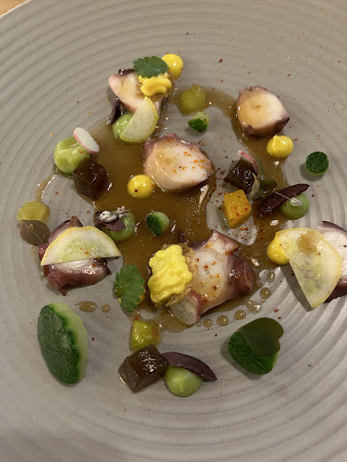 Exceptional cooking, notably the beautifully presented octopus, tuna in fig leaf with pollen and red wine reduction (very cleverly proceeded by a small entremets of tuna and honey tartare to accustom the palate to the combination), and a brilliant Galician beef, also served with a little saussisson-style tartare.