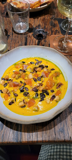 This has really been our only food disappointment in Beaune and the surrounding region. While the vibe and service are fine and the entree and dessert were wonderful, the runny arugula ravioli in crab bisque with smoked perch and haddock was a total fail. Basically a wet egg-bun filled with a flavourless green mess, on a bed of overcooked pasta sheets, sitting on a bed of wet overdone greens, all soaked in a sauce that may have been appropriate for something else, but not this, with tiny cubes of haddock and perch. My comments are entirely personal for us but it amazed me how the chef could combine so many unidentifiable items similarly and totally lacking in any texture but with opposing flavours that were entirely non-complementary. Sort of like a seniors-home-hell main dish for people without teeth. It looked like the other four entrees of red meats on the menu were very nicely done so we just picked the wrong dish. The bananas flambé dessert was an excellent and needed palate cleanser. We were really looking forward to dinner here so it was a total downer because of that one dish but, obviously, other reviews are excellent so I wouldn’t discourage trying it out…..just don’t order that dish. Ever. Under any...