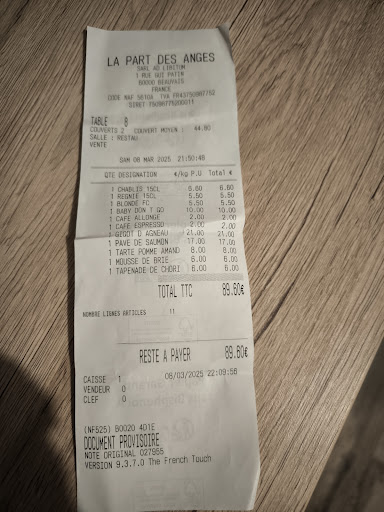 Read moreMa conjointe et moi sommes venus nous restaurer à La Part des Anges pour mon anniversaire. Ce restaurant m’avait été chaleureusement recommandé par mon entourage. Quelle bonne idée nous avons eu ! Nous fumes chaleureusement accueilli à notre arrivée. Une fois bien installés, nous avons dégusté de délicieux cocktails qui ne manquaient pas d’originalité. Nos entrées respectives étaient somptueuses et pleine de créativité. Pour ma part (des anges?) j’ai choisi les gnocchis : elles avaient un goût et une texture de noix de st jaques ! Exquis ! Puis, nous nous sommes orientés sur le veau en plat principal. Il était tellement tendre que je pouvais le couper avec le dos de ma fourchette ! La purée de panais avait une texture inédite à mes yeux, et d’une finesse incroyable. Enfin, nous avons pris un sorbet aux agrumes avec une meringues suisses. Un dessert plein de légèreté et de gourmandise à la fois. Le chef nous a même fait apporter 2 coupes de champagne (pour trinquer à mon anniversaire). Le service a été rapide, le chef nous a servi en personne et à pris le temps de nous expliquer consciencieusement les plats que nous dégustions ! C’est un réel restaurant gastronomique avec des prix très abordables ! Pour conclure, je recommande vivement cet endroit très cosy avec une ambiance jazzy très reposante ! Je vous dis donc à...