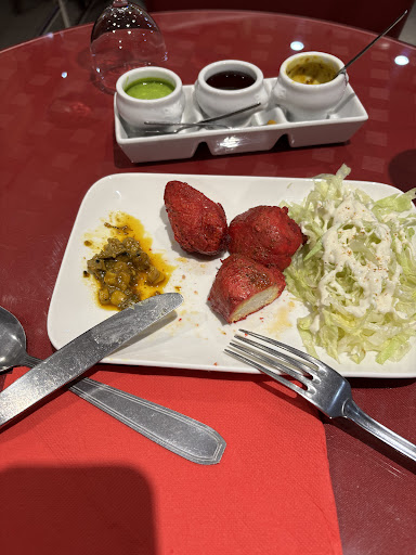 Jai pris poulet butter...morceaux de poulets en sauce et riz à part, incroyablement et exceptionnellement, c est une sauce légÚrement sucré salé mais vraiment trÚs bon... Samoussa trÚs bon..les 3 sauces trÚs bonnes ,( dans les autres resto indien il y a une sauce chocolat là c était caramel original et bon)