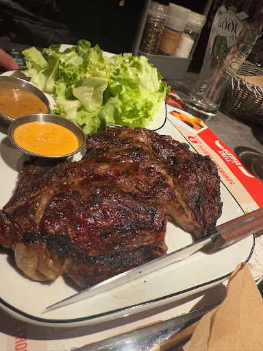 Nice immitation of an American steakhouse. Typixal American food but no steaks. There is a false filet, oit of experience a fatty piece and an Entercote. Onn the images in the restaurant they display these beautiful thick slices of meat that you receive in the US, Germany, Italy and Switzerland. Here not. It is a fatty 5mm disk that we call trash. In the IS you would go to prison for such a crime. They ask for the cuissance but it arrives cooked lile a shoe sole, no wonder with 5mm thickness. They should rename it to American dinner and remove the so called steaks from the menu. Like thatvI would...
