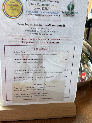 Read moreDe passage sur Delle nous avons testĂ© l'hostellerie des remparts avec nos cousins. Accueil courtois et simple. Service professionnel avec tout de mĂȘme une mĂ©connaissance des vins affichĂ©s Ă la carte. DĂ©cor assez simple mĂȘlant des parties rustiques et d'autres plus modernes. La carte affiche un menu entrĂ©e plat et dessert Ă 41euros 50 que l'on peut adapter Ă deux plat pour 30 euros 50. Il y a aussi un menu Ă 57 euros. Globalement l'assiette est bonne et bien prĂ©sentĂ©e. Je mettrais un petit bĂ©mol sur le dessert qui est assez fade (tartelette) et pas en adĂ©quation avec la qualitĂ© de l'entrĂ©e et du plat.La carte des vins propose des flacons assez sympas pour des prix relativement raisonnables. Attention les millĂ©simes ne sont pas affichĂ©s et c'est dommage pour un restaurant proposant des menus Ă ce prix. (Ă amĂ©liorer....). Les hĂŽtesses et serveuses sont sympathiques et font le job. Globalement cet Ă©tablissement propose une carte correcte avec un rapport qualitĂ© prix acceptable. Les toilettes sont trĂšs propres. Ne fera pas parti de mes meilleurs souvenirs pour un menu de cette...