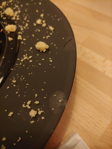 Le dessert, tarte citron meringuée, rebelote assiette ébréché... La déco à base de brisures de sablé à mon sens ne rend pas hommage au travail du dessert, en effet ça goûte l'humidité... La tarte en elle même est pas mauvaise, l'appareil citron est puissant et bien contrebalancer par une meringue légère, seul le biscuit rend ce dessert triste c'est vraiment dommage...