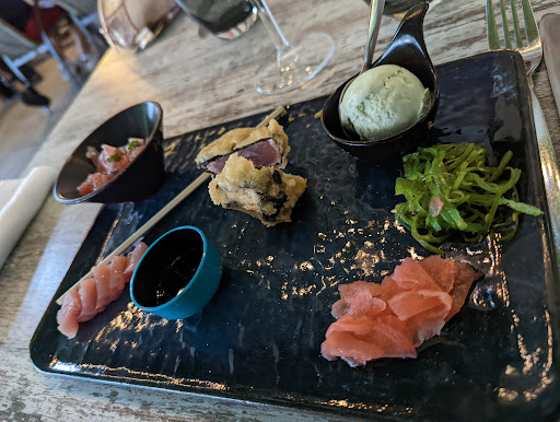 Read moreRéservation difficile a avoir, je peux le comprendre période de vacances et nous avons accepté le deuxième service sans problème, nous aurions aimé avoir le choix entre intérieur et extérieur car a 21h30 et une petite brise, avec une fin vers 23h, mais pas possible ... L'accueil est parfait et les mesures covid bien appliquer, l'envoie du menu par SMS c'est très bien, la carte est alléchante et donne envie ... La déclinaison de thon était parfaite, malgré une portion que le serveur a fait tomber a terre en hurtant le verre a champagne ( changer bien entendu)... Cet après que cela a été moins bien, les brochettes d'agneau avait perdu le goût de l'agneau... Marinade trop prononcé et cuisson trop forte je suppose ... Pour le dessert la mousse vanillé avec une vanille lointaine, trop lointaine a mon gout ... Conclusion même si il n'y a rien a dire sur la qualité des produits, sur le service et la gentillesse du personnels, cela ne justifie pas le prix de la facture, qui pour finir notre soirée, nous nous sommes aperçus d'une erreur en notre défaveur de 3 €, qui ne nous a pas ruiné certe, mais bon voilà ... Peut être a refaire dans d'autres conditions ... Si vous trouvez le nombre d'étoiles restreint,, cela est mon ressenti...