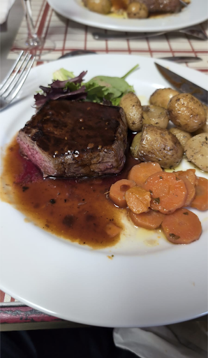 Read moreViande moyenne, pas très tendre. Garniture frites / salades : 1 petite feuille de salade. Frites très bonnes par contre. Erreur de commande, la serveuse insinue que c’est de notre faute, aucune compensation, l’une d’entre nous n’a pas pu manger le plat commandé. On lui donne du veau à la place sans lui demander son avis….. peut être n’en mange-t-elle pas ? Aucune excuse rien. Plus de pain au moment des entrées, on demande de la sauce supplémentaire, pas possible. Pas de pain, dans pas possible de prendre le fromage au menu. Obligés de prendre un dessert sucré, et la…. Ben il n’y avait plus grand chose, plus de fondant au chocolat. Pas de fromage non plus…. Donc plus grand choix. Là encore on sent qu’on « saoule » la serveuse qui marmonne. On sent la serveuse agacée tout le long du service, par notre groupe, alors que franchement on est resté super cool et souriants malgré tous les problèmes. Elle sort « la clope au bec » en soufflant. Elle dit des gros mots à l’office devant les toilettes. Bref, pas un bon moment...