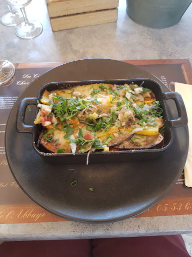 Read moreAprès une excellente visite du cloître de Cadouin, nous nous sommes installés en terrasse pour l'apéro. Après 10 minutes d'attente, une jeune serveuse prend mollement notre commande et nous demandons une assiette de petites choses à grignoter. Nous ayant assuré qu'elle nous amenait tout cela, celle-ci disparaît. Enjoués et assoiffés, nous patientons... Nous ne l'avons jamais revue...Un peu plus tard, un autre serveur nous voyant installés sans consommation, reprend notre commande. Mais là, l'assiette n'est pas possible. Quelques cacahouètes peut-être mais pas sûr. Faisant contre mauvaise fortune bon coeur, nous acceptons les "cahouettes", qui finalement n'arriveront jamais jusqu'à notre table. Décidant de s'arrêter là, nous passons aux sanitaires. En rentrant dans le café, nous suivons les mouches jusqu'au bar où une lampe bleue les grille de façon régulière. Clac clac. Les toilettes sont situées juste à côté du comptoir en face de la porte des cuisines. Miam! Nos petites amies les mouches nous précédent et nous indiquent le chemin des commodités avec enthousiasme et vivacité. Certaines restent avec nous d'ailleurs pour observer d'un oeil goguenard la magnifique affiche collée à la porte côté trône. Celle ci vaut le pesant des fameuses cacahouètes absentes car elle rassemble des photos improbables de gens (anciens clients ?) plantés fièrement sur leur mobylette. Nous nous hâtons d'en finir avec cette aventure et nous disons adieu au bar à mouches sans autres formes de procès. Ce qui nous surprend le plus dans cette histoire, c'est que cet "établissement" a l'encart du petit futé 2018. Un conseil : ne...