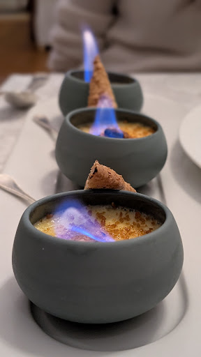 From a food perspective there were highs and lows, the amuse bouche, and risotto were outstanding, we were slightly perplexed as to whether the scallop dish was meant to be warm or cold as mine was cold and my partners was luke-warm, the palate cleanser was supposed to be lemon and vanille however I couldn’t detect any citrus at all while my partner suspected citron essence had been used. The lamb was disappointing, overcooked and under seasoned, serving meat on such hot plates affects the tenderness and continues cooking it. The dessert was a bland parfait in an over-sweet liquid, unfortunately the most disappointing part of the meal came at the end therefore it has remained in our memory the most.
