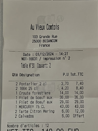 Read moreUne honte, un scandale. Hier soir, samedi 18 janvier 2025 nous sommes allé manger au vieux comtois à Besançon; je précise que nous avons l'habitude de nous y restaurer avec plaisir, c'est pourquoi nous y revenons de temps en temps...hélas car cette fois, bien que le service fut rapide et la cuisine toujours aussi bonne, nous fûmes installés dans une salle non chauffée de la semaine : glaciale malgré la présence d'un pauvre radiateur qui ne suffisait pas à monter la température. Bien que le repas était de qualité, notre plaisir fut gâché par ce froid. Au moment de régler l'addition, nous en fîmes la remarque au patron qui fît l'étonné alors que nos voisins de table étaient partis sans même passer commande tant c'était glacial et qu'une autre table était partie sans prendre de dessert!!! Pas le moindre geste commercial, pas la moindre excuse. Je pense que ce monsieur est juste là pour faire du fric, le bien-être du consommateur, il s'en moque. Comptez sur moi pour vous faire une publicité à la hauteur de votre mépris. Je ne vous...
