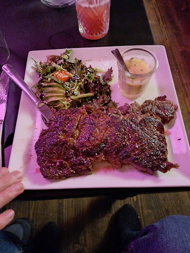 For the food quality the speed was remarkable, so much so that it seems that they brought it before I chose and it was easy to do so because the bar had the very same Entrecôte and it looked proper yet it tasted far better than looked. The rooms are nice in the chic way with the cozy blue that repeats itself on the most beautiful doors of French old houses, contrasted with a funky ceiling of triangular funky motifs. Pity that it is slightly noisy, so a little sound deadening would improve on the mood but surely that is also to blame on the happy groups...
