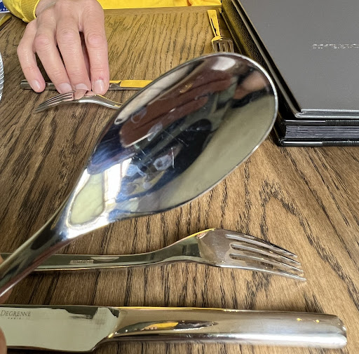 Seconde surprise, les tables sont espacées de 20 cm, en cas de manque de pain on peut se servir sur la table du voisin. Autre détail qui a son importance, la maison Loiseau devrait contrôler le travail du plongeur, les couverts étant des 2 côtés de la table propres mais plein de traces de calcaire (voir photo jointe)