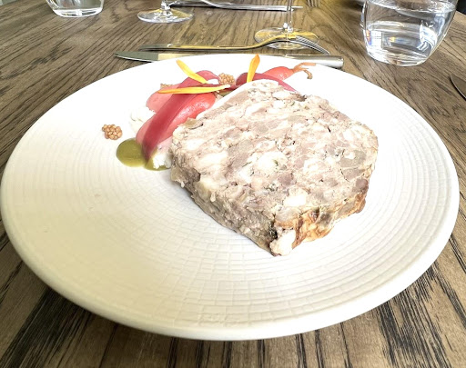 L'entrée est sympa, minimaliste, le gravlax de truite est réussi, la portion est on en peut plus chiche, digne d'un gastro, de l'autre côté de la table une terrine maison, en haché gros, pas très bien taillée, avec quelques pickles, c'est assez réussi malgré un dressage sans grande prétention.