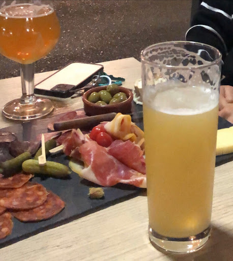 Nous avons commandĂ© un fuet au poivre (pas de bol, une serveuse nous a apportĂ© le fuet nature mais trop tard je l'ai dĂ©couvert qu'aprĂšs l'avoir coupĂ© et goĂ»tĂ©. Je n'ai pas voulu embĂȘter en redemandant celui au poivre) et une petite planche mixte. SincĂšrement, sur la planche il y a avait plus de fromages que de charcuterie. Certains morceaux de fromage paraissaient secs, visuellement comme en bouche.