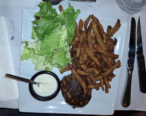 Ensuite mon conjoint a pris un pavé de bœuf (cuit à point) avec de la sauce roquefort accompagné de frites et quelques feuilles de salade. Cuisson respectée et il était ravi. (Il avait hésité avec de l'andouillette qui d'après l'assiette servie sur la table d'à côté lui a semblé très appétissante)