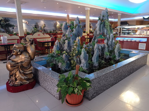 Alors d 'abord déçue par l ' extérieur bien moche Une fois dedans : surprise ! Arrivés à 16 personnes , 2 grandes tables rondes pour 9 couverts sont rapprochées et hop nous voilà installés dans un angle avec le sourire entre une baie vitrée avec vue sur le parking et une salle adjacente non éclairée car non occupée donc au calme entre nous ! Bon début ! Dressage des tables gai couleur dominante rouge Sièges confortables Les apéritifs servis aussitôt Puis la ronde autour des buffets Pas de file d ' attente circulation libre et fluide Du choix Belle présentation de sushis Un rayon alléchant de produits crus bien frais pour les sauter au wok . Là encore pas d 'attente Accueil agréable Desserts variés Salle non bruyante et pourtant bien remplie Espaces compartimentés Judicieusement répartis Avons passé une heure agréable à nous régaler de façon raisonnable et gourmande de mets délicieux froids ou chauds salés sucrés pour moins de 20€ .Ravis .A recommander vivement pour un plaisir...