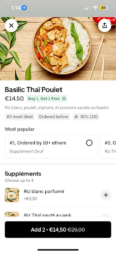 J'ai commandé une grosse commande de 50 euros, plus plusieurs plats. Le poulet au basilic sur la photo et la description est totalement différent de ce que j'ai reçu. Il n'y avait presque pas un morceau de poivron et d'oignon dans une assiette, et seulement de l'oignon dans l'autre. La sauce était presque inexistante et le riz n'était pas frais. Je pense qu'ils n'avaient plus de légumes et ils ont préparé ma commande sans se soucier du fait que je la payais. Mauvaise expérience à ne pas renouveler ici. Je vous déconseille fortement d'essayer. L'autre assiette de poulet pad thaï n'était pas bonne non plus, mais pas autant que les deux autres. Les gyozas aux légumes n'étaient pas frais, secs et sans goût.