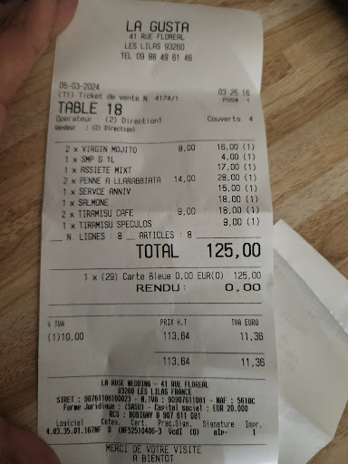 Read moreJe suis allé dans ce restaurant samedi 2 mars a 20hh . Je vous conseille vraiment le restaurant la gusta. C'est un lieu chaleureux , très accueillant . Le gerant s'est bien occupé de nous. On a commandé le mix de pizza, l'entrecote avec les pâtes humm un vrai délice. De plus, le dessert tiramisu a la pistache était un vrai regal. J'ai très bien mangé c'était très délicieux et copieux. Le Virgin mojito était super bon ( a la fruit de la passion) et un autre mojito au lichi c'était vraiment trop bon .je remercie vraiment le gerant de me le l'avoir conseillé . Je souhaiterai aussi rajouter que la musique et l'ambiance est vraiment super. J'aime beaucoup ce lieu notamment la decoration ( une belle verdure , très lumineux , bien espacé) . C'est vraiment un lieu que je conseillerai de s'y rendre . Personnellement je reviendrai dans ce restaurant avec plaisir car je me suis vraiment régalé . Le personnel est très accueillant et très souriant . Ce fut une grande joie de manger dans ce restaurant italien. J'ai même manger et aimer les tomates alors que de base je déteste les tomates .franchement dans ce resto j'ai tout aimé y compris les tomates. Merci pour le moment que j'ai pu passer dans ce lieu. C'était très agréable de passer la soirée dans ce restaurant . Merci aux personnels Merci aux cuisiniers Merci...