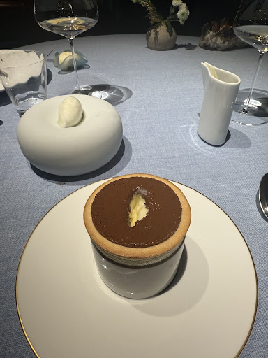 My wife and I planned our trip to Chamonix several months ago, and with a few weeks of arriving we were able to make a reservation here which was awesome on such short notice. This would be our first Michelin Star, actually in France. We looked at the menu ahead of time and planned to go with the seven course, as our reservation was a little on the later side. We made it to the hotel where they they took our coats, as we walked towards the restaurant we passed a woman singing while playing the piano in the room before entering. In theory this would have been a nice touch, but she was absolutely belting it, it was disruptive and made the noise level in the dining area much louder than what I think is appropriate for this sort of faire. Not only was it hard to hear ourselves at the table much less the waiters trying to explain each dish. This brings me to the food. Ordering from the menu of only a few options took quite a while. When we requested a wine menu, an ipad was thrust upon us with 35 pages, impressive but quite a lot to study in a timely manner. I expected better summary of the wine options and pairings than what was offered, which was none. We selected a bottle of a local savoie region white wine on our own, which we enjoyed. By the time we received our bottle and served the first course an hour had passed since being seated. This seemed long but the time was filled with some palate cleansers but all before the meal seemed different. The seven course felt completely sufficient as it had a variety of different flavors. Overall the food was what I would expect from a dining experience of this level. The trout was a little bland with a highlight of the flavors butternut Corsican orange and ice cream with fennel flavors that came with dessert.