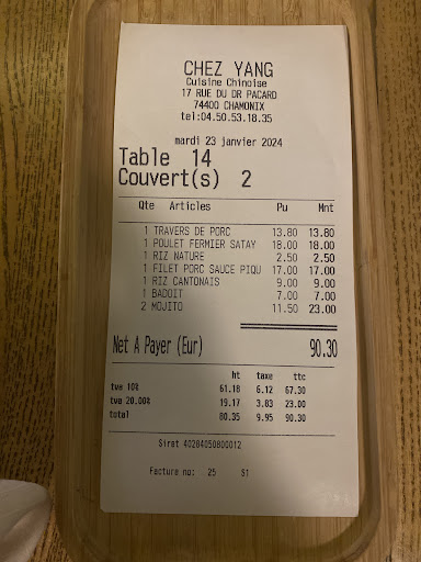 The menu at Chez Yang is uninspired and lacks any standout dishes. Many of the items are overly greasy or bland, with ingredients that don't seem particularly fresh. Portions are inconsistent, often too small for the price being charged. Service is another weak point; the waitstaff appear disinterested and occasionally forget orders, resulting in long waits for food that isn’t worth the wait.