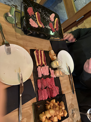 The leak (pruneau) with cheese were EXCELLENT..we had a cheese fondue; it’s delicious though very heavy (obviously) and comes with 2 small green salads and a platter of ham and sausage.. Now the food is tasty but I don’t understand how a fondue for 2 can be charged 70 plus dollars; it’s a lot but this is the price of fondue everywhere in Chamonix..