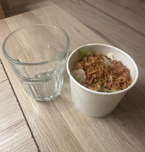 En revanche, les crousti halloumi étaient vraiment mais vraiment caoutchouteux l’impression de mâcher 4 petits pneu à 5€30!!! De plus j’ai été très déçu par la portion de salade que j’ai pris pour accompagner le burger. Pour 4,30 € supplémentaires, je m’attendais à un accompagnement un peu plus généreux. Là, c’est vraiment très, très peu, au point que ça semble presque symbolique (regardez la portion à côté d’un simple verre alors imaginez dans une assiette. Et pour couronner le tout, il n’y avait pas la moindre petite sauce pour relever ou accompagner la salade, ce qui aurait pu rendre l’expérience plus complète et agréable.