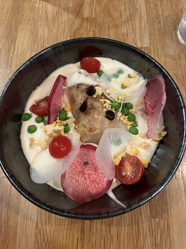 The fish was dry and in a soup of ‘potato’ that tasted like béchamel. The black garlic is the small dots of black you see on the photo - couldn’t taste it in the plate. It was made beautiful with some tomatoes and radish, neither added any taste to the dish.
