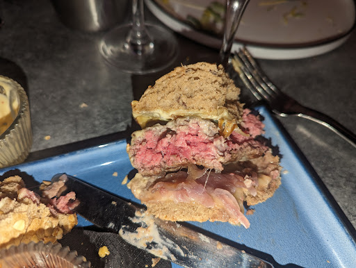 La première fois que nos hamburgers sont sortis, il était clair, dès que nous les avons coupés, qu'ils n'étaient pas assez cuits (voir photo). Nous avons attiré l'attention du serveur et lui avons expliqué pourquoi nous voulions qu'ils soient plus cuits, et il nous a assuré qu'ils seraient cuits à nouveau. Pendant ce temps, notre ami avec le tartare de saumon a dû manger seul. Quinze minutes plus tard, nous récupérons enfin nos hamburgers et, à notre grande surprise, ils n'étaient toujours pas cuits ! C'est à ce moment-là que nous avons commencé à être frustrés car nous étions là depuis une heure, nous avions déjà renvoyé nos hamburgers et ils n'étaient toujours pas cuits correctement. La situation s'est encore aggravée lorsque nous avons renvoyé nos burgers, attendu et que les burgers sont revenus, TOUJOURS crus au milieu. Le chef nous a assuré qu'il les avait mis au four, mais ce n'était manifestement pas possible car ils étaient toujours crus... Si vous avez l'intention de vendre une bouteille de vin à 450€, alors vous devriez avoir les connaissances nécessaires pour cuire correctement un hamburger et offrir un meilleur service. Le serveur au caractère bizarre qui refusait de demander à la cuisine de cuire correctement nos hamburgers ne devrait vraiment plus travailler dans cet établissement. Même lorsque nous lui avons demandé un Coca Cola, il nous a dit qu'ils n'en avaient pas de manière impolie et n'a pas voulu nous dire qu'ils avaient juste une version différente jusqu'à ce que nous le demandions. Je suis sûr que le restaurant nous dira que nous aurions dû insister sur la cuisson du hamburger, mais je vous assure que nous l'avons fait à plusieurs reprises. Ils nous diront également qu'ils nous ont offert les hamburgers à la fin... Et bien premièrement, nous n'avons même pas pu les manger même après la troisième cuisson et deuxièmement, nous avons dû insister pour qu'ils soient retirés de l'addition. Une vraie honte pour un restaurant sympa sur l'eau car nous n'étions pas les seuls à être mécontents de notre nourriture et du service ce soir là. 1/5 commence ne reviendra pas et ne sera...