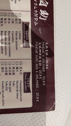 Read moreThere are two menus: one which follows the usual entrée plat dessert format that most Westerners would be accustomed to, and the other which is written in simplified Chinese with french translations and is meant for the typical Chinese meal of ordering multiple dishes and sharing them with the entire table. They also offer sichuan-style hotpot (火锅).