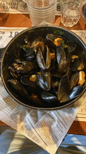 Les plats arrivent et là c'est la catastrophe : 1 plat de moules gratinées chorizo-pesto mais sans pesto ce qui est complètement sec, 1 plat de moules en papillote façon thai sans gout.