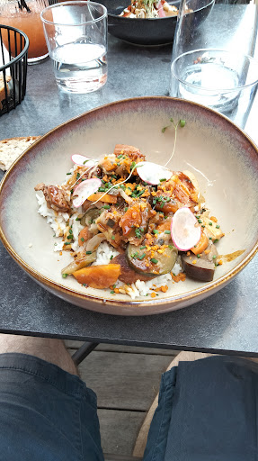 We had a weeknight flight planned and were in search of a place near/in Mérignac where we could get a small bite before our departure. We were able to reserve this rooftop bar/restaurant for 6pm. No one in France eats this early. The service crew gathered for their meal around 6:30pm. We chose a mix of things from the entree menu and several from the tapas. The asparagus was good (4 stars). The pulpo itself was well cooked and generous but the avocado mousse lacked some flavor. The salmon gravlax/ricotta/rhubarb combo felt a little odd. In general the dishes leaned towards acid. The overall rating is in context of food for a restaurant. The bar menu was extensive and extensive rooftop patio seating with beautiful umbrellas appears to be the draw of this place. As we were about to drop off our rental and board a plane we were not the cocktail-sampling crowd. The service was friendly but as we “hit” them before their prime hours I think they were warming up and not yet in their groove. For example, we wanted to request 3 small plates so we could sample different dishes and cut them on our own plate. We were quickly presented with the bread basket (generous) and our server joined the crew dinner table. We didn’t feel like...